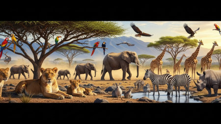 This image showcases various African animals in a savanna environment. Elephants, giraffes, lions, zebras, and rhinoceros are among the wildlife. The scene features lush trees, a body of water, and an open sky, creating a vibrant display. The composition and colors make it suitable for various commercial uses.