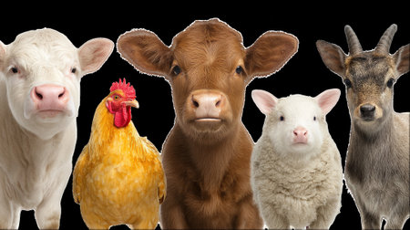 Farm animals cow, pig, sheep, chicken, and goat isolated on transparent background