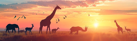 Silhouettes of animals on golden cloudy sunset background