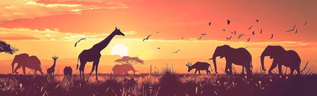 African savannah landscape with wild animals at sunset, vector illustration.