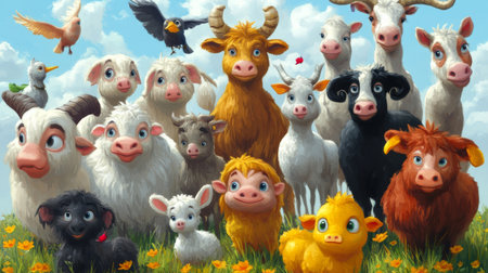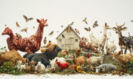 A detailed display of various farm animals gathered around a rustic wooden barn. Generate AI