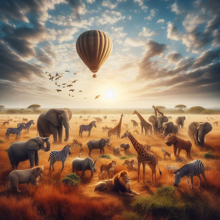 African safari landscape with hot air balloon and herd of wild animals