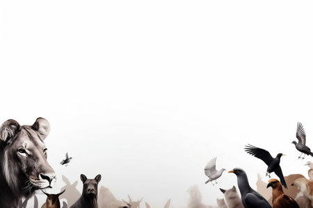 lion and flock of birds on white background with space for text