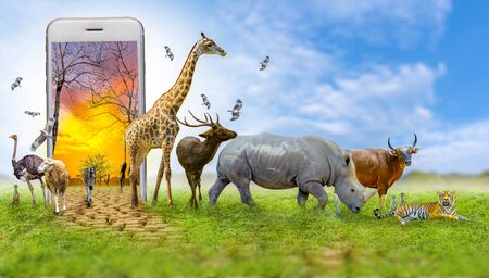 animal of the world with fresh green grass and blue sky