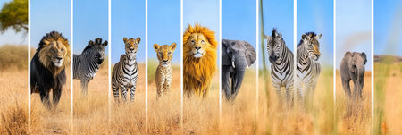 Collage of Wild Animals from African Savanna, Featuring Lion, Zebra, Elephant, Cheetah, and Leopard