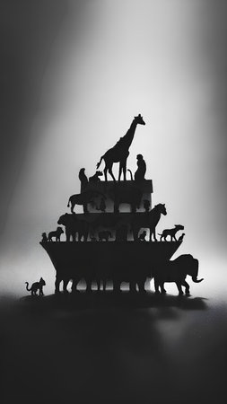 Group of wild animals in front of a dark background. Black and white.