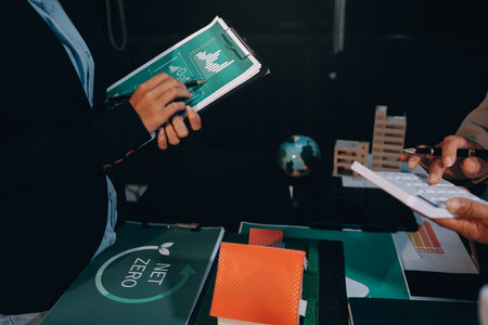 Renewable Energy Strategy and Eco-Friendly Solutions. Professionals reviewing graphs and data on sustainable practices.