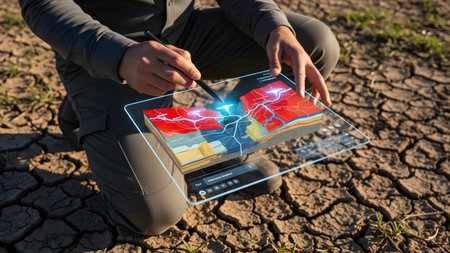 showing geologist using tablet with holographic geological layers model in dry cracked...