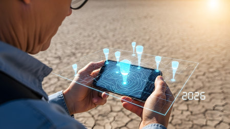 A person holds a smartphone showing a holographic map projection with glowing blue markers and...