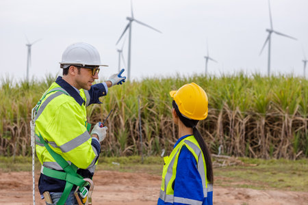 Team engineer of wind turbine worker pointing working about renewable energy at station energy power wind. technology protect environment reduce global warming problems.