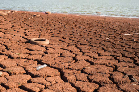 landscape of the shore of a dry lake. On the shore, red ore, impregnated, with cracks in the ground. Polluted coast. Ukraine, Krivoy Rog. Riverbank waste pollution. Drying of the lake, lack of fresh water. Tire pollution from riverbank cars