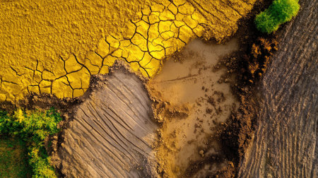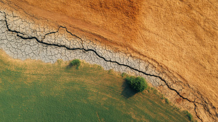 Stunning aerial shot of a drought-affected landscape showcasing cracked soil contrasting with vibrant green and golden fields, illustrating environmental changes and agricultural challenges.