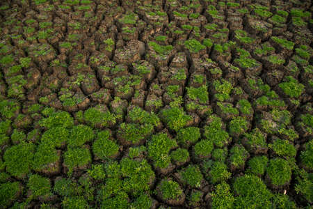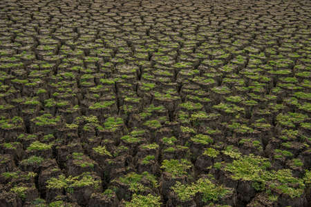 Green plant grow in middle dry cracked earth. recovery environmental from damage of climate change and human activities concept.