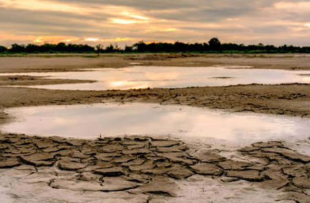 Climate change and drought land. Water crisis. Arid climate. Crack soil. Global warming. Environment problem. Nature disaster. Dry soil texture background. Nature lanscape in the morning with sunrise.