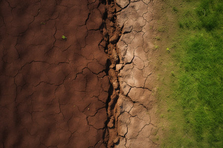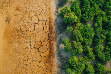This image showcases the stark contrast of drought-affected land next to a vibrant green landscape, highlighting the impacts of climate change on nature.