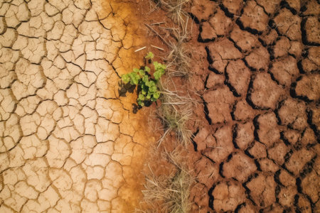 This striking image showcases a landscape of cracked dry earth interspersed with a single green plant, symbolizing resilience in the face of drought.