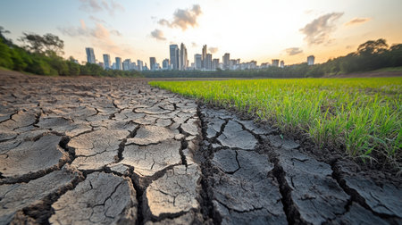 Cracked earth reveals a stark contrast to lush greenery and a vibrant city backdrop at dusk.
