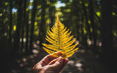 Woman hand gently holding a single, vibrant autumn leaf with red and yellow hues against a blurred forest background, illuminated by warm sunlight. represents nature, season, and change.