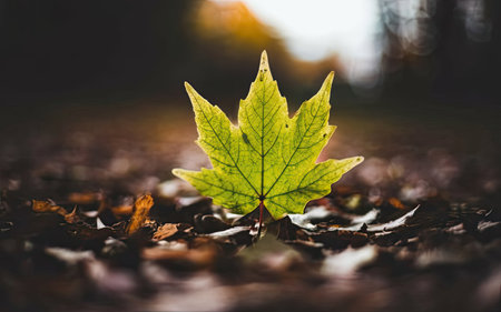Glowing autumn leaf illuminates bed of fallen leaves, creating warm and inviting atmosphere. intricate details of leaf veins are highlighted, showcasing nature beauty