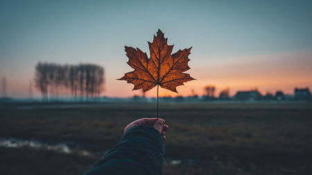 Autumn maple leaf in the hand of a man on a background of a sunset