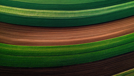 Aerial shot of rolling farm fields with alternating bands of green and brown earth