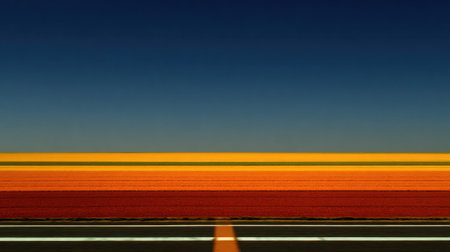 Highly stylized and abstract view of agricultural fields organized into distinct horizontal color bands, resembling stripes of deep red, various shades of orange, and bright yellow, all situated beneath a vast expanse of deep indigo sky. The foreground features a dark strip suggesting a road or path marked with white and orange lines.