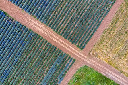 Aerial view of roads between lavender fields. Agriculture drone shot. Ecology agriculture, growing plants on big land.