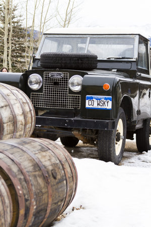 Front view of old vintage Land Rover military jeep SUV parked on the street