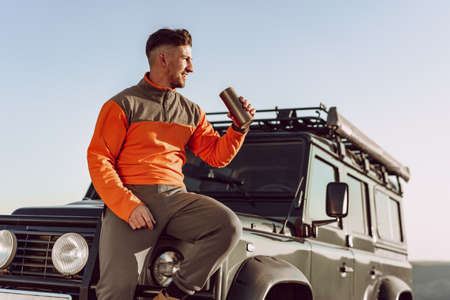 Young man traveler drinking from his thermocup while halt on a hike