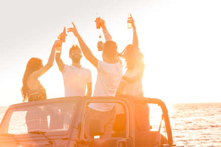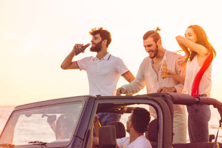 Five young people having fun in convertible car at the beach at sunset.