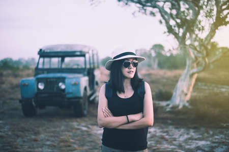 Hipster traveller asian woman standing and looking something at outdoor on during sunset,Relaxing time
