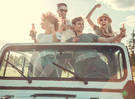 Happy young people are holding bottles of beverage, dancing and smiling while travelling by car in sunny weather