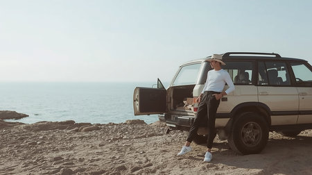 serene beach suv adventure lifestyle with ocean horizon calm waves and coastal escape perfect for travel freedom relaxation and outdoor exploration in nature