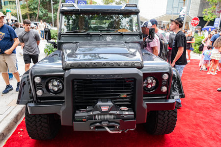 Miami, Florida, USA - February 16, 2025: Luxury SUV car Land Rover. Car Range Rover parked outdoor. Grey car, front view. Land Rover Defender SUV car.