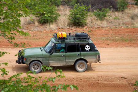 Offroad in Namibia with green car and red desert - Kaokoland