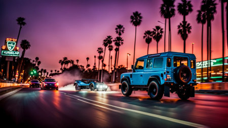 Classic-style retro vintage 4x4 english classic truck SUV Off-road capable SUV with roof lights on leaving dust trail as it speeds through the night AI GENERATED