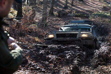 Offroad car driving through the forest road of mud