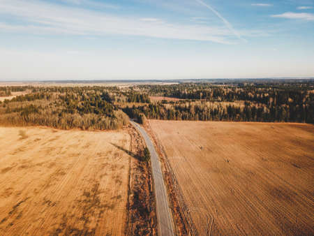 Road and agricultural fields aerial view. wide meadow landscape with roadway