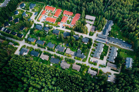 Aerial view of rural village, residential area with houses or cottages in Finland