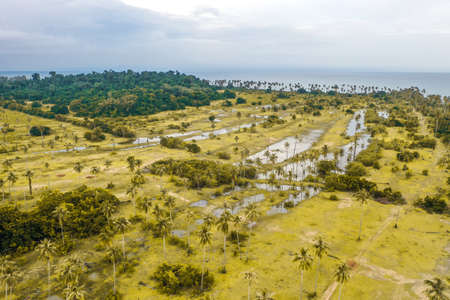 Top down slow motion aerial cityscape with lodges, homes, buildings roofs and roads at green tropic forest. Epic urban scenery of Palawan resort at summer. Cinematic soft sun light drone top-down shot