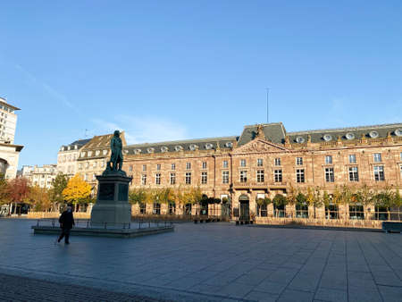Strasbourg, France - Oct 31, 2020: iconic Place Kleber in central Strasbourg during general lockdown due to Covid-19 pandemic situation worldwide with few pedestrians on a morning cold fall day
