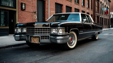 A beautifully preserved vintage car, featuring a dark blue body and a white roof, parked in a rustic urban alley. The retro design, including chrome detailing and an iconic grille, reflects timeless elegance. Surrounded by red brick buildings and urban charm, the setting perfectly complements the classic aesthetic. Ideal for showcasing automobile history, vintage culture