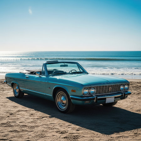 An AI-generated illustration of a retro car' shiny metallic surface in sunlight.