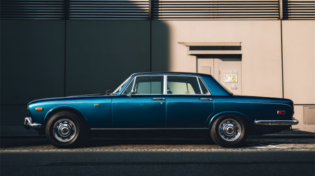 Side profile of classic luxury car in deep blue color, parked in front of modern minimalist building, soft sunlight highlighting curves