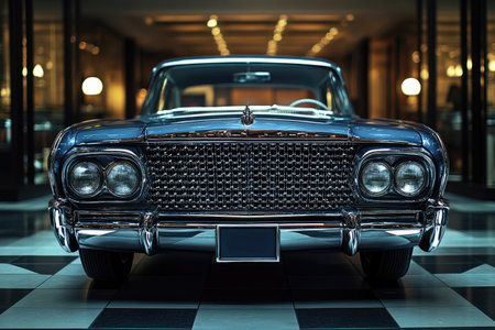 Classic american car in the city at night. Front view.