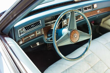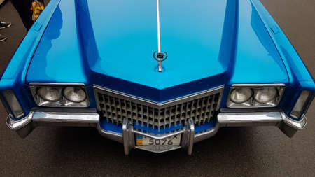Ukraine, Kiev - March 27, 2020: vintage retro classic car Cadillac beatriz of blue color. emblem on the hood with a logo. original parts of the restored American car. photos from different angles
