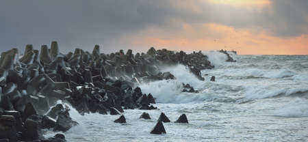 Baltic sea under dramatic sunset clouds after storm. Liepaja, Latvia. Breakwaters close-up. Epic spring landscape. Cyclone, gale, rough weather, meteorology, climate change, natural phenomenon