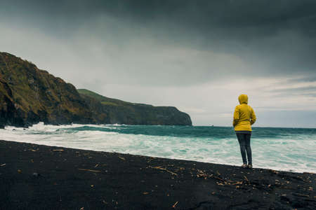 A young man adventurer with contrast yellow jacket posing over cliff by sea under gloomy sky with dramatic clouds