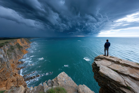A man standing at the edge of a cliff, looking at a stormy sea under a brooding sky, shot with a wide-angle lens, portraying the struggle against the elements