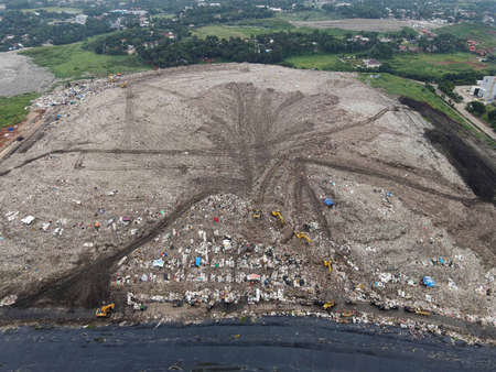 Aerial View. Large landfills like mountains. the tractor take garbage on landfills with noise cloud after rain and cityscape at Bekasi - Indonesia February 15, 2021